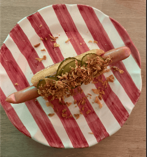 4. Tilføj syltede agurker og drys med glutenfri ristede løg.
